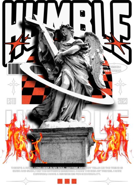 Άγαλμα αγγέλου με σταυρό σε κόκκινο/μαύρο φόντο με flames και κείμενο «ΤΑΠΕΙΝΗ».