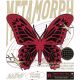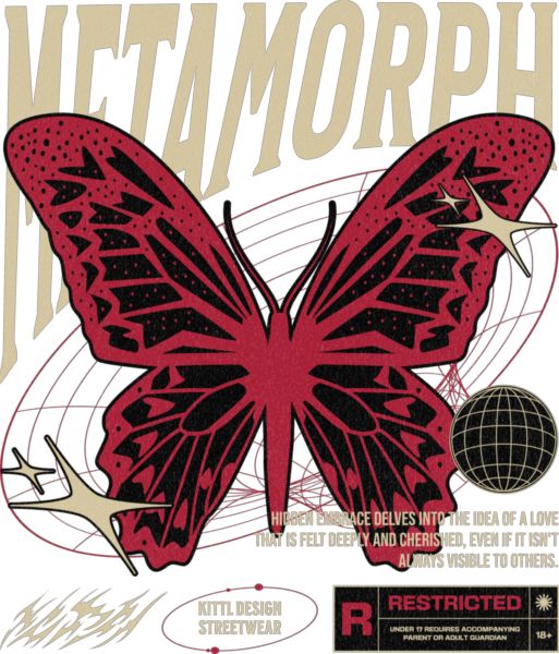 Μεγάλη κόκκινη πεταλούδα. Κείμενο «METAMORPH» και απόσπασμα για αγάπη. Streetwear vintage στυλ.
