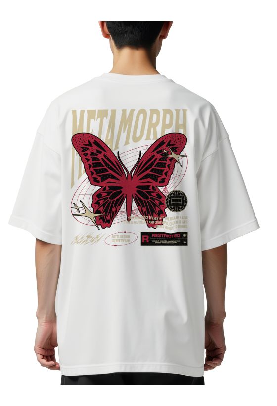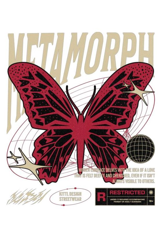 Μεγάλη κόκκινη πεταλούδα. Κείμενο «METAMORPH» και απόσπασμα για αγάπη. Streetwear vintage στυλ.