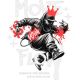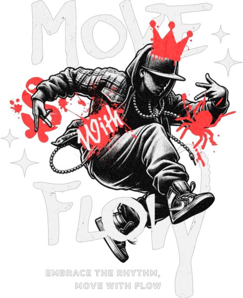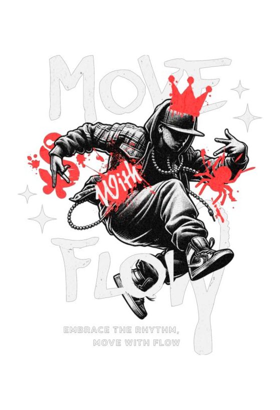 Χορεύτρια hip-hop σε αέρα, σε μαύρο-κόκκινο-λευκό. Κείμενα «Move with Flow» και «Embrace the Rhythm».
