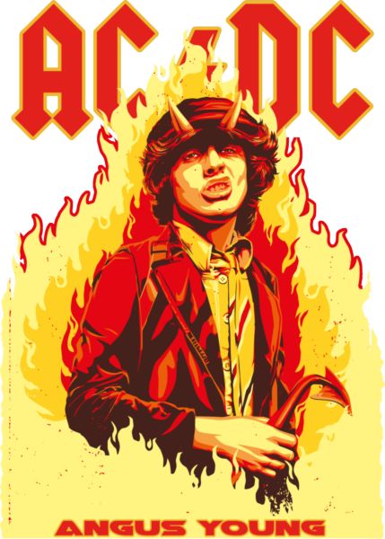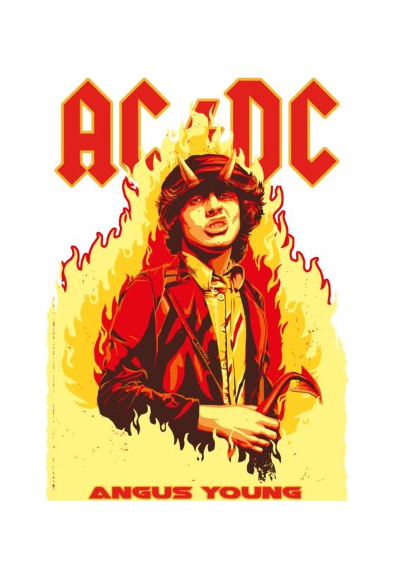 Angus Young σε διαβολική περσόνα με κόρνα, ουρά και φλόγες, λογότυπο AC/DC από πάνω.