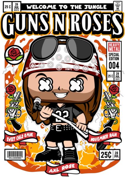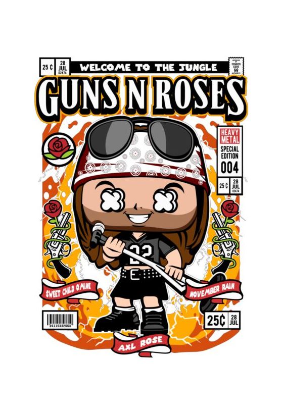 Funko Pop Axl Rose σε εξώφυλλο κόμικ «Heavy Metal Special Edition», με τριαντάφυλλα και πανό τραγουδιών.