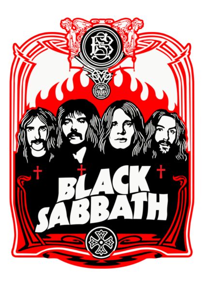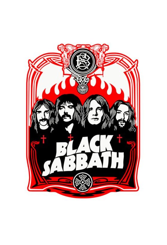 Black Sabbath lineup (Ozzy, Iommi, Butler, Ward) σε ασπρόμαυρο με κόκκινο-λευκό πλαίσιο και λογότυπο "BLACK SABBATH".