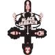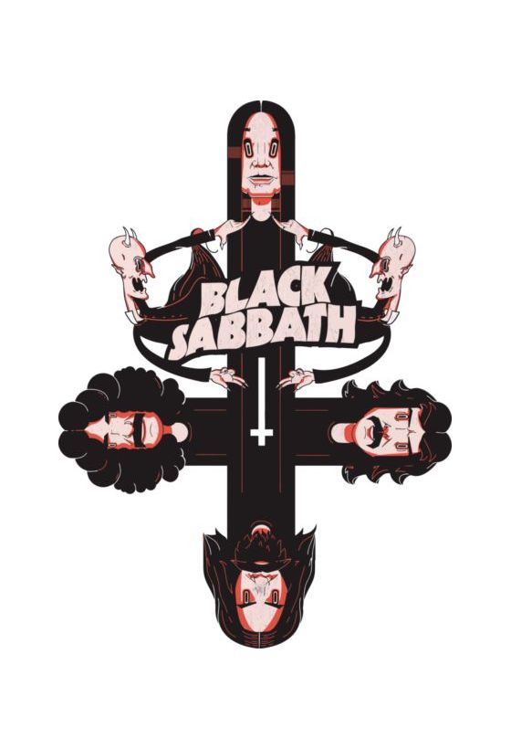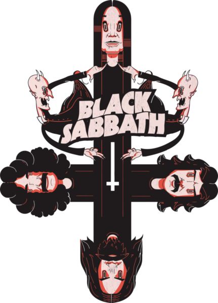 Καρικατούρες μελών Black Sabbath σε σχήμα σταυρού με λογότυπο στο κέντρο.