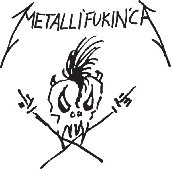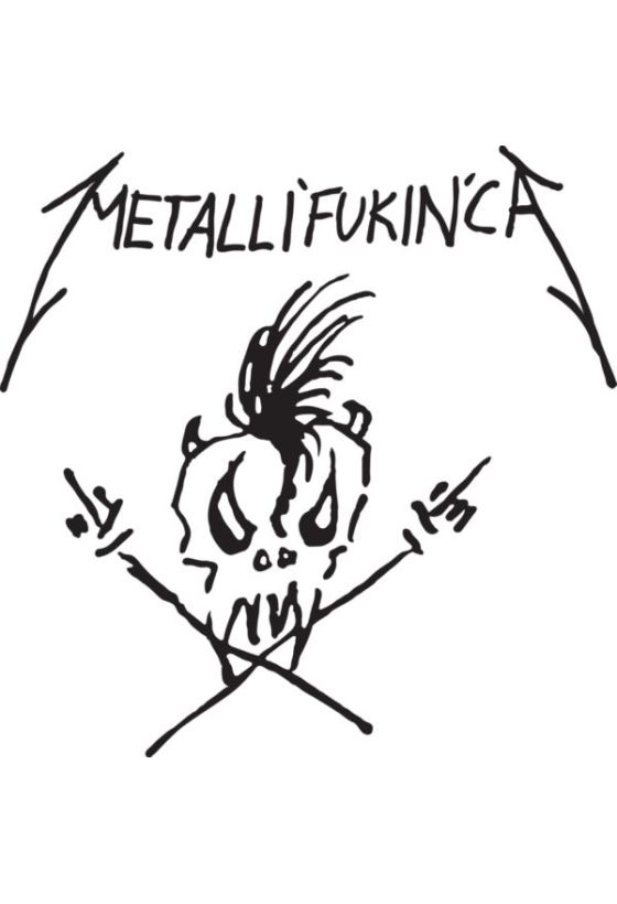 Κρανίο με μοχόκ, χέρια "rock on", κείμενο 'METALLIFUKIN'CA'.