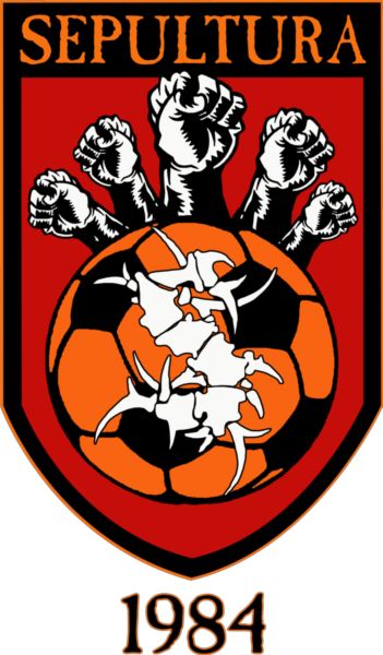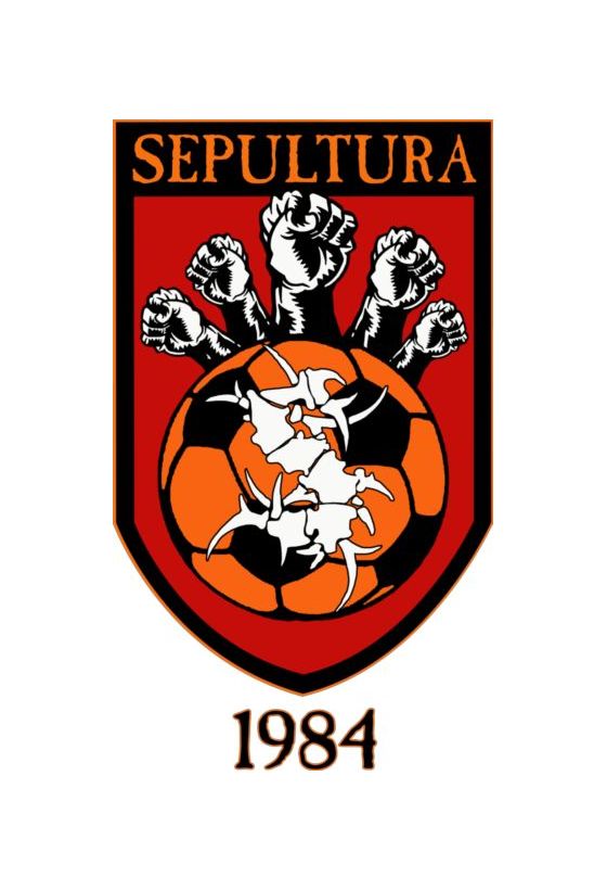 Sepultura λογότυπο με γροθιές και πορτοκαλί μπάλα ποδοσφαίρου σε κόκκινη ασπίδα.