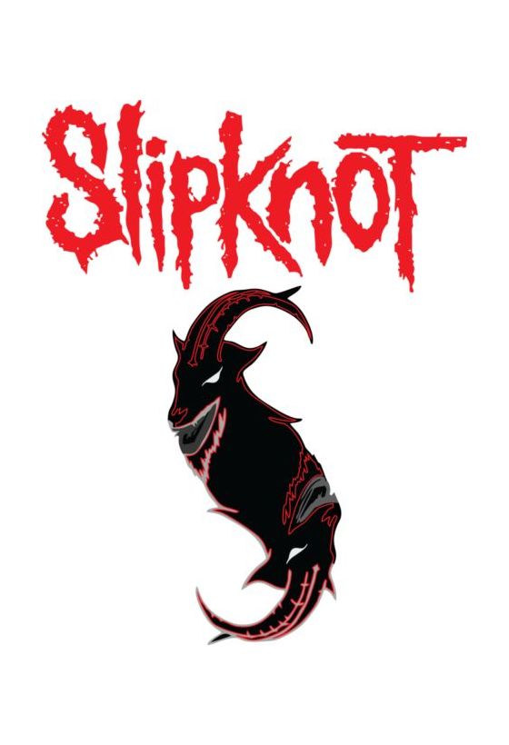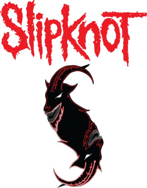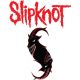 Slipknot λογότυπο με κόκκινη γραμματοσειρά, δαιμονικά πλάσματα με κέρατα.