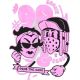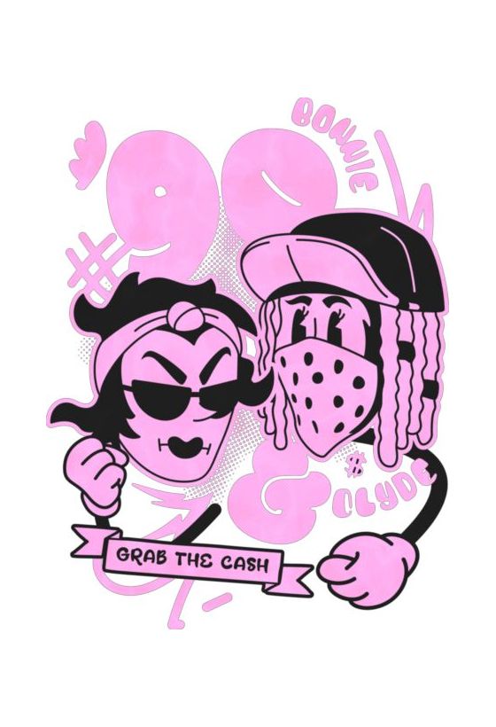 Ζευγάρι σε στυλ Bonnie & Clyde, σε δίχρωμο ροζ/μαύρο. Κείμενα «BONNIE», «CLYDE» και «GRAB THE CASH».