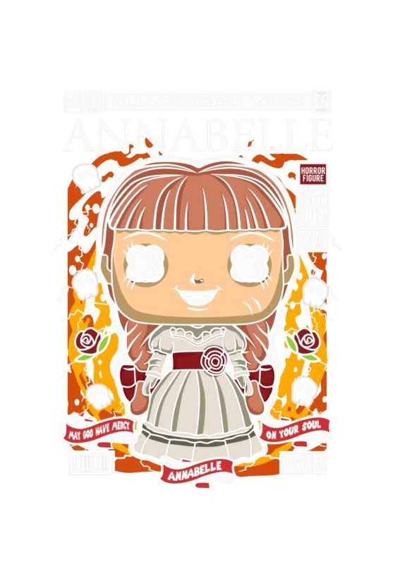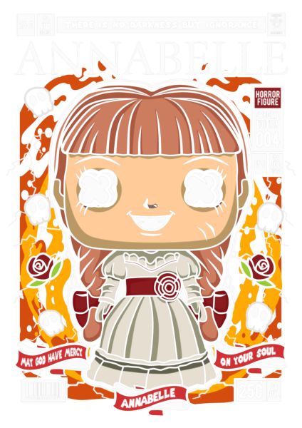 Εξώφυλλο κόμικ με Funko Pop Annabelle σε σκοτεινό πορτοκαλί-κίτρινο φόντο με κρανία.