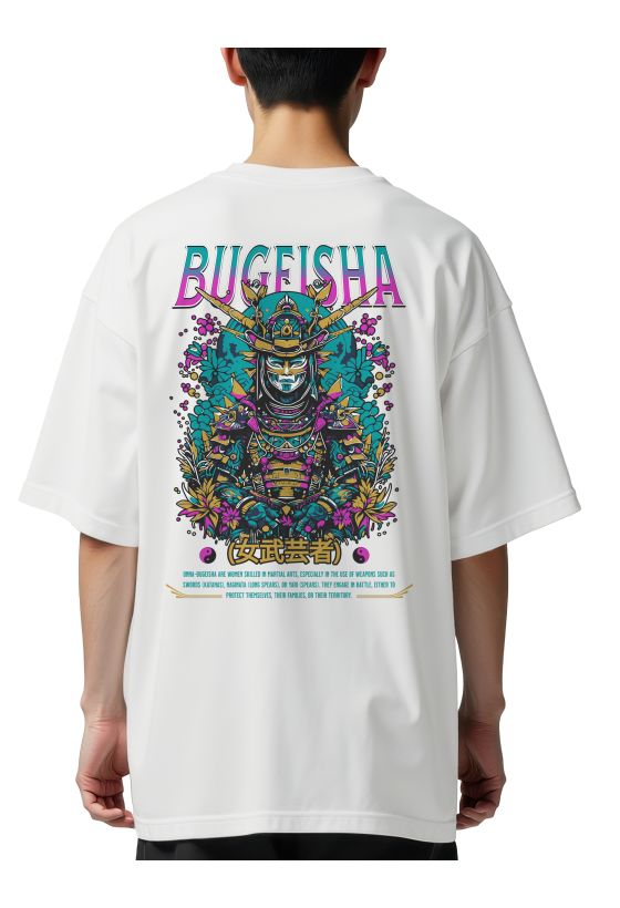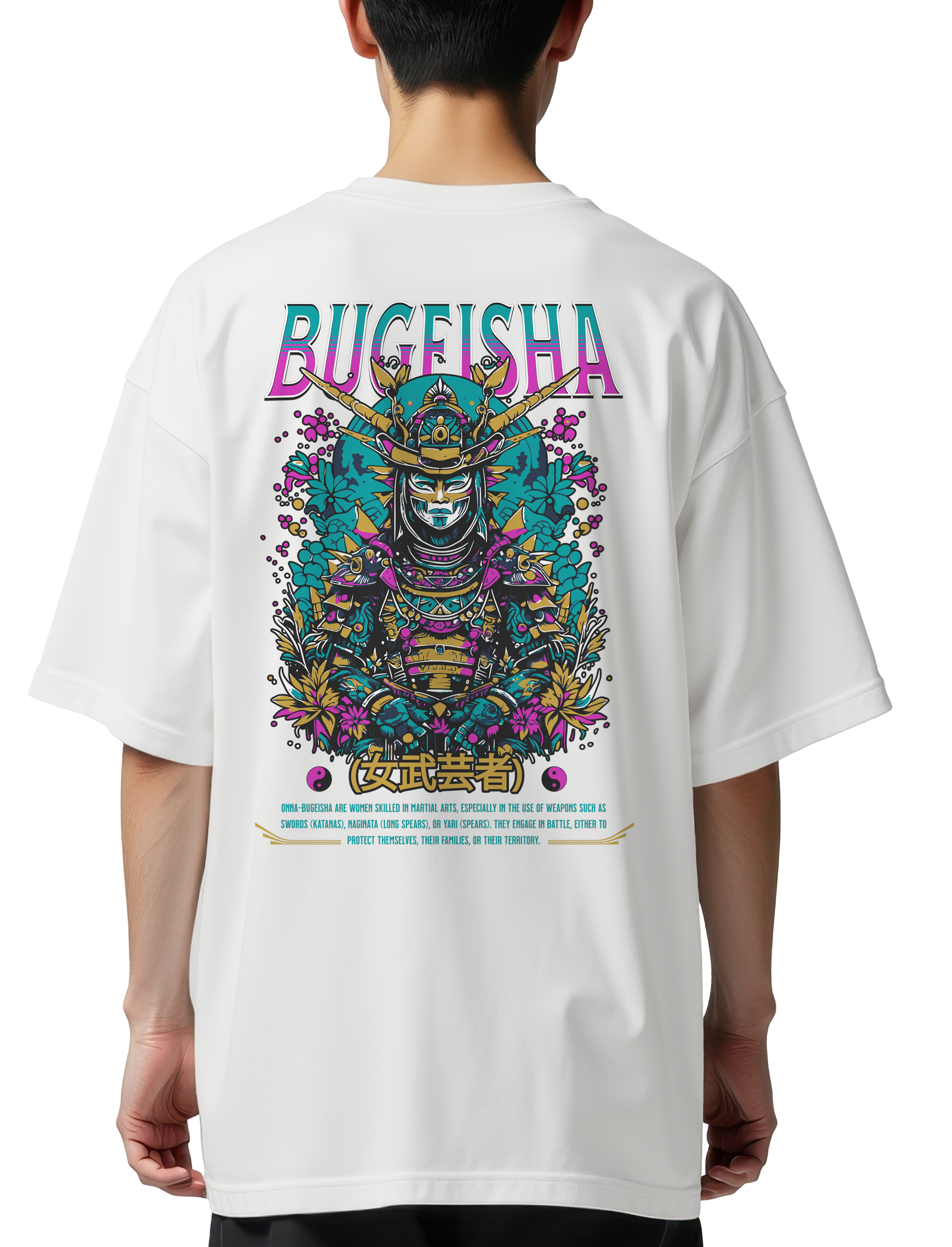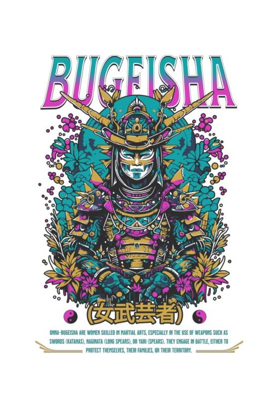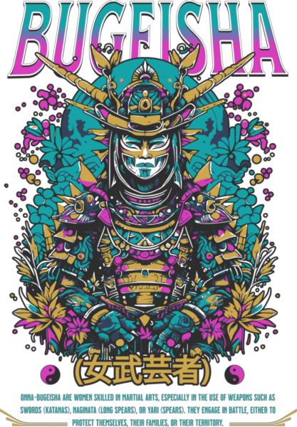 Γιαπωνέζα πολεμίστρια Onna-Bugeisha με πανοπλία και κράνος. Χρώματα γαλαζοπράσινο, ματζέντα, χρυσό, μαύρο. Τονίζεται η ιστορική σημασία.