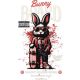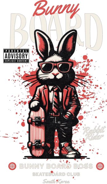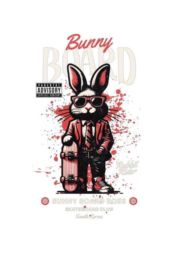 Κουνέλι με κοστούμι, κόκκινα γυαλιά και skateboard. Κείμενα: «Bunny Board», «Rabbit Rider». Street-art ύφος.