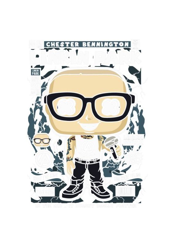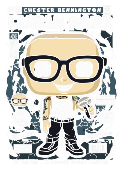 Funko Pop Chester Bennington (Linkin Park), μικρόφωνο, σκοτεινό φόντο με αστραπές, τίτλοι τραγουδιών και λογότυπο συγκροτήματος.