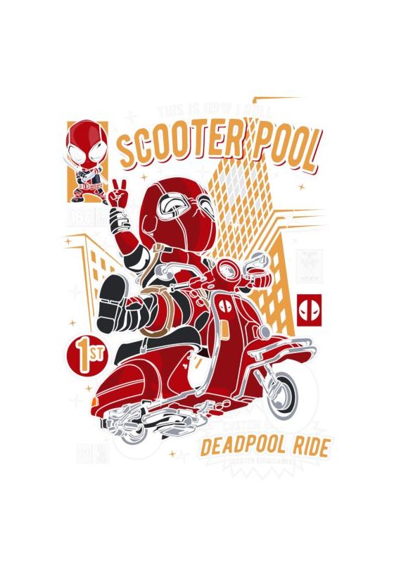 Funko Pop Deadpool σε κόκκινο σκούτερ, τίτλος «This Is How I Roll», στοιχεία κόμικ.