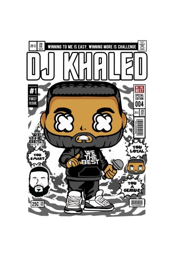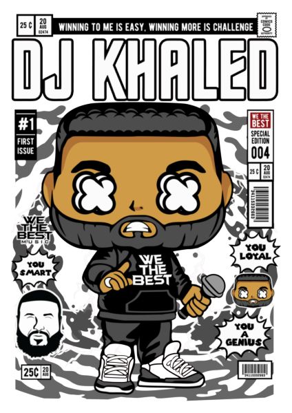 Funko Pop DJ Khaled, τίτλος «DJ KHALED #1», φόντο με αστραπές, συννεφάκια με φράσεις.