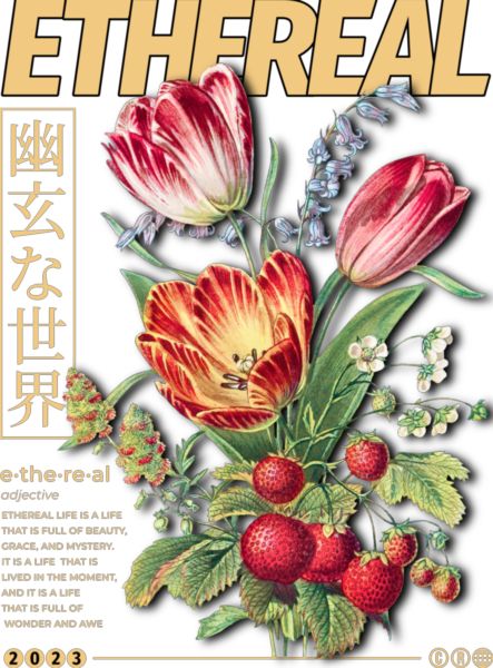 Βοτανική σύνθεση με τουλίπες, καμπανούλες και φράουλες. Κείμενο «Αιθέρια» με χρυσά γράμματα. Ορισμός της λέξης και χρονολογία 2023.