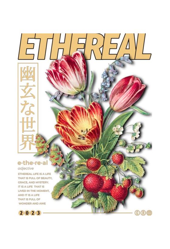 Βοτανική σύνθεση με τουλίπες, καμπανούλες και φράουλες. Κείμενο «Αιθέρια» με χρυσά γράμματα. Ορισμός της λέξης και χρονολογία 2023.