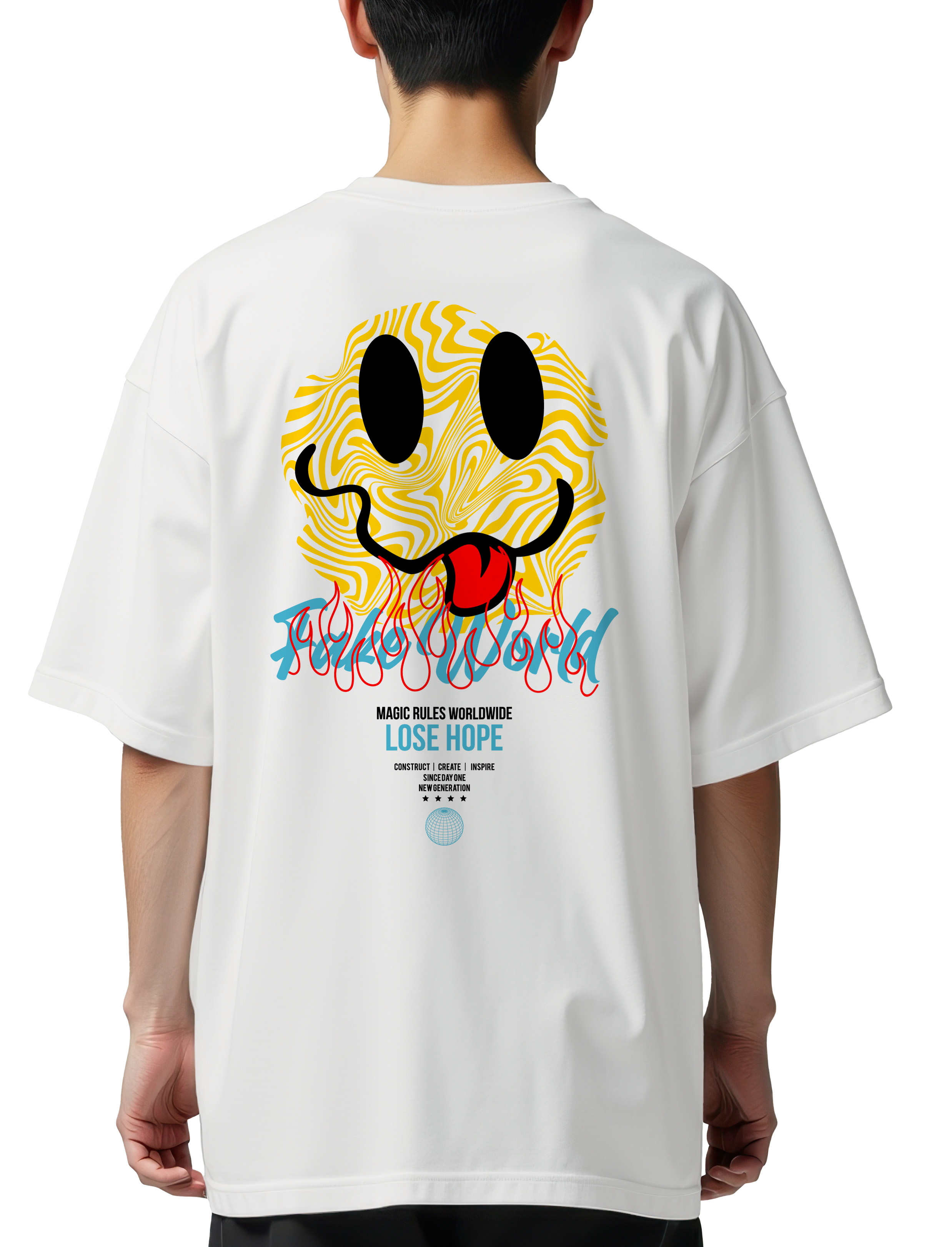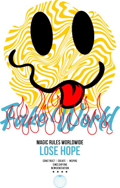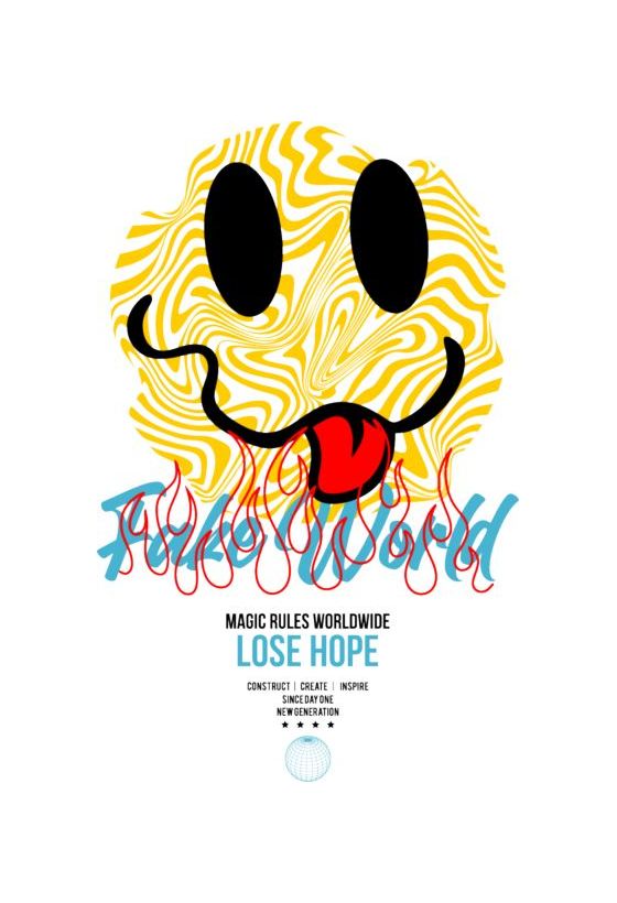 Παραμορφωμένο smiley με κόκκινη γλώσσα, κείμενα «Fake World», «LOSE HOPE».