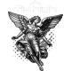 Αγγελική φιγούρα σε γκρι κλίμακα με φτερά ανοιχτά. Κείμενο «Fly High» με τρία αστέρια.