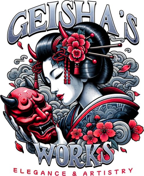Γκέισα με κόκκινα άνθη και κέρατα, κρατά μάσκα Hannya. Φορά κιμονό με μοτίβα, πλαισιωμένη από σύννεφα και άνθη sakura. Κείμενο «Geisha’s Works Elegance & Artistry».