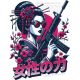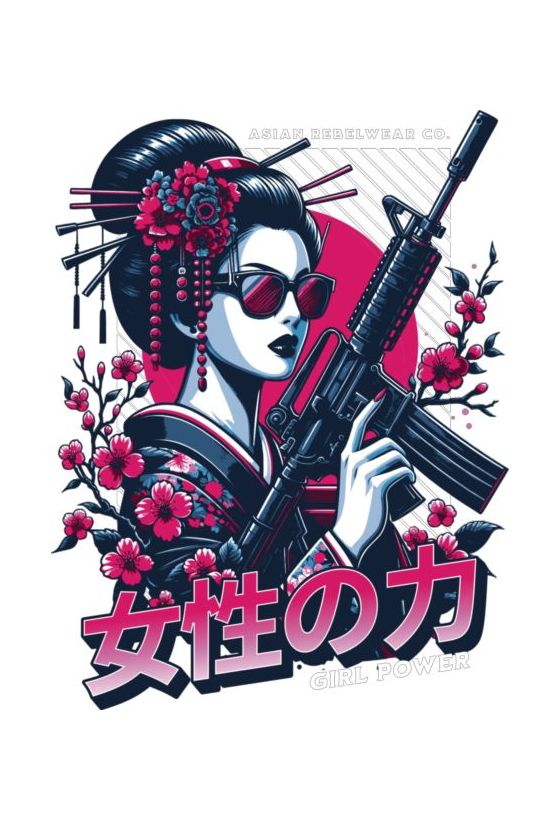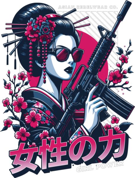 Γιαπωνέζα με floral κιμονό και στολίδια, φορά γυαλιά ηλίου και κρατά τουφέκι. Φόντο με άνθη sakura και κύκλο. Κείμενα «Girl Power» (EN/JP).