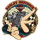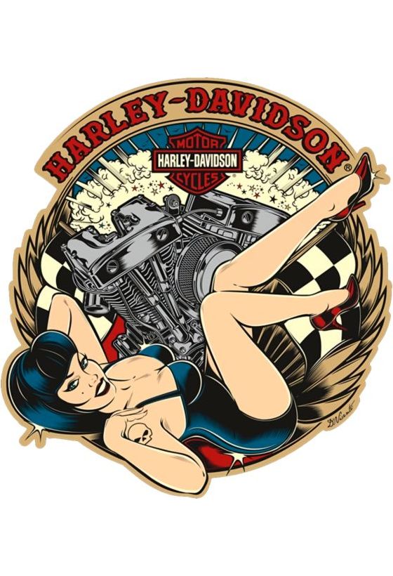 Pin-up γυναίκα σε Harley-Davidson μοτίβο με κινητήρα, σημαίες και logo HD.