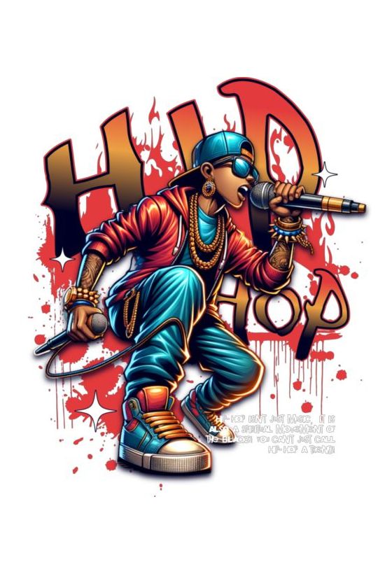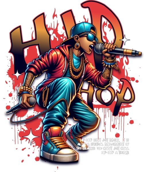 Καλλιτέχνης hip-hop με μικρόφωνα, χρυσές αλυσίδες και κείμενο «HIP HOP». Μήνυμα για πολιτιστική σημασία.