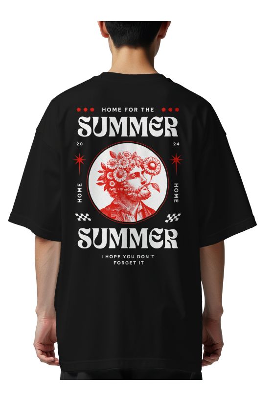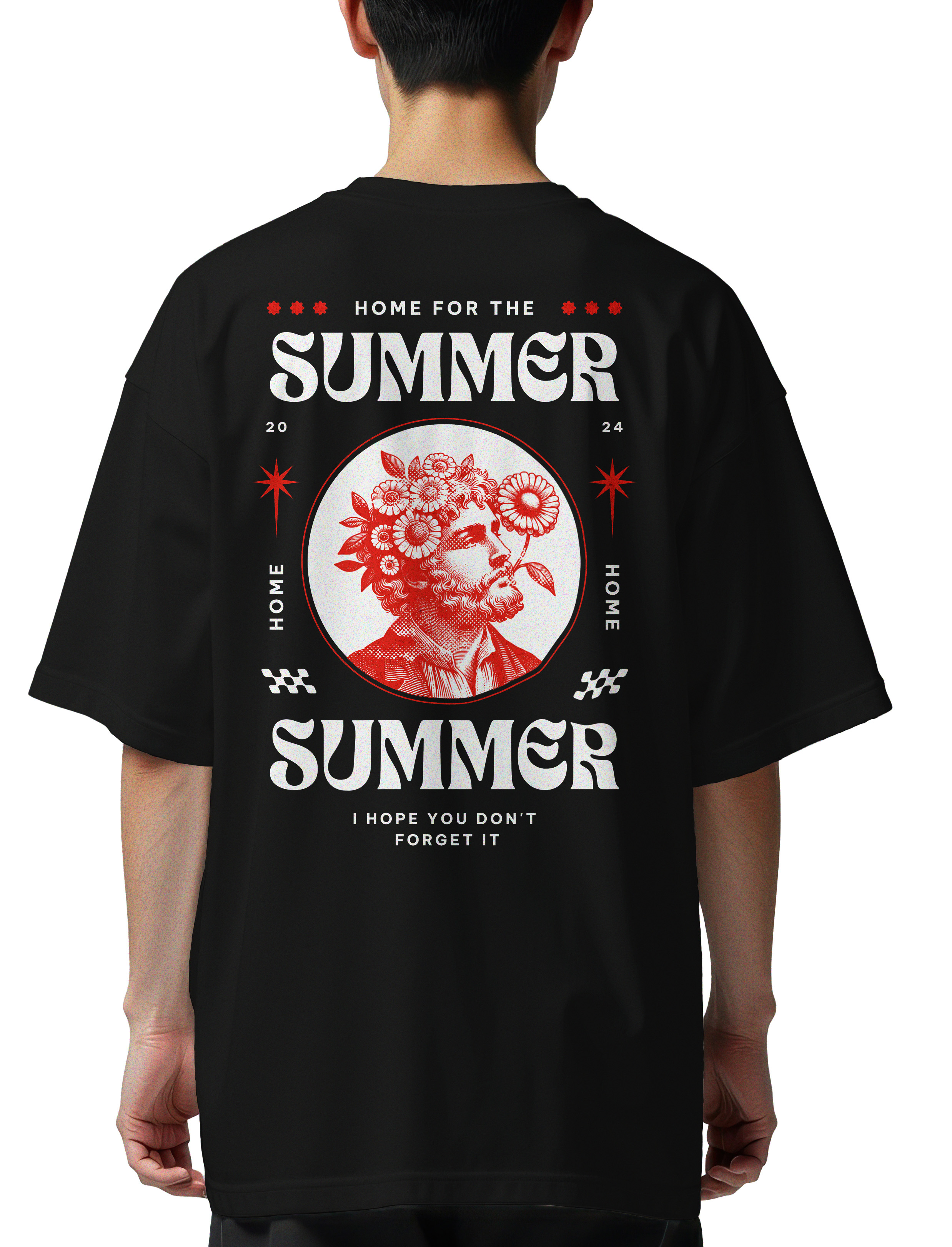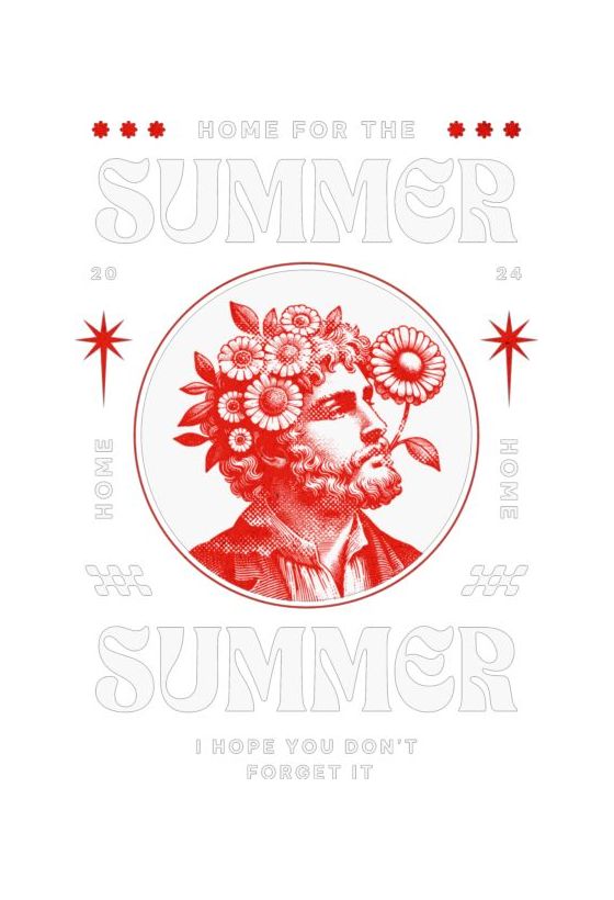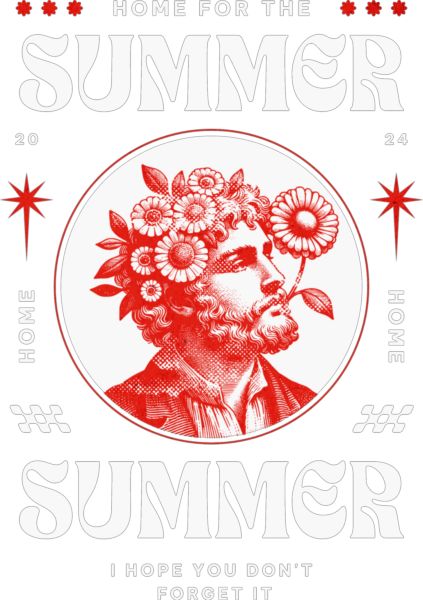 Ανδρικό μπούστο με λουλούδια σε κόκκινο/λευκό· κείμενο «HOME FOR THE SUMMER».