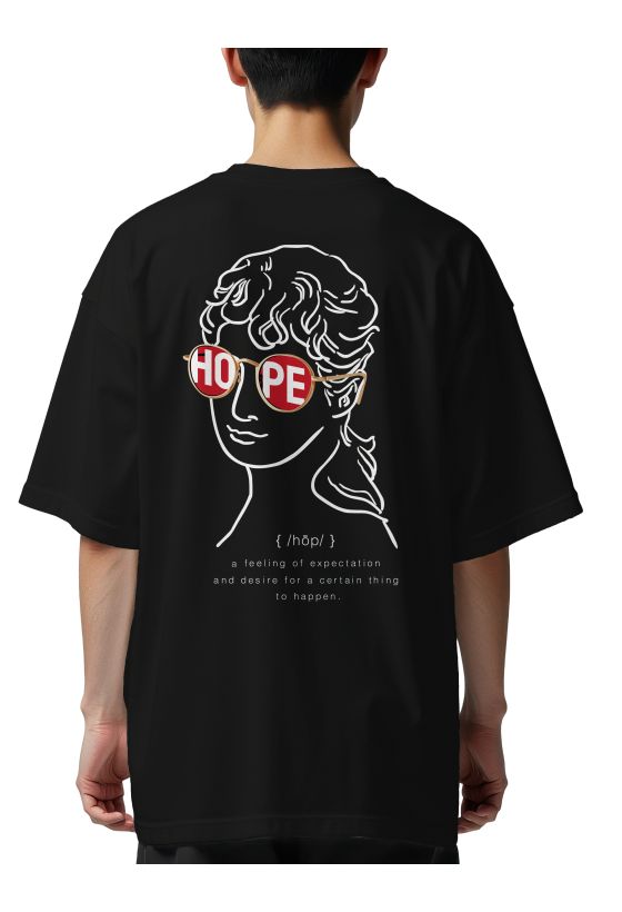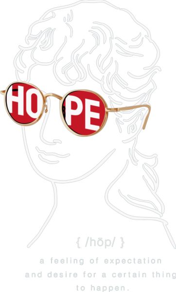 Κλασικό μπούστο με μοντέρνα κόκκινα γυαλιά· κείμενο «HOPE» με ορισμό.