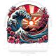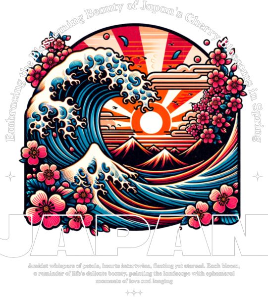 Στυλιζαρισμένο κύμα με ήλιο και βουνά, πλαισιωμένο από άνθη sakura. Θέμα άνοιξη Ιαπωνίας, σε τολμηρό γραφικό στυλ.