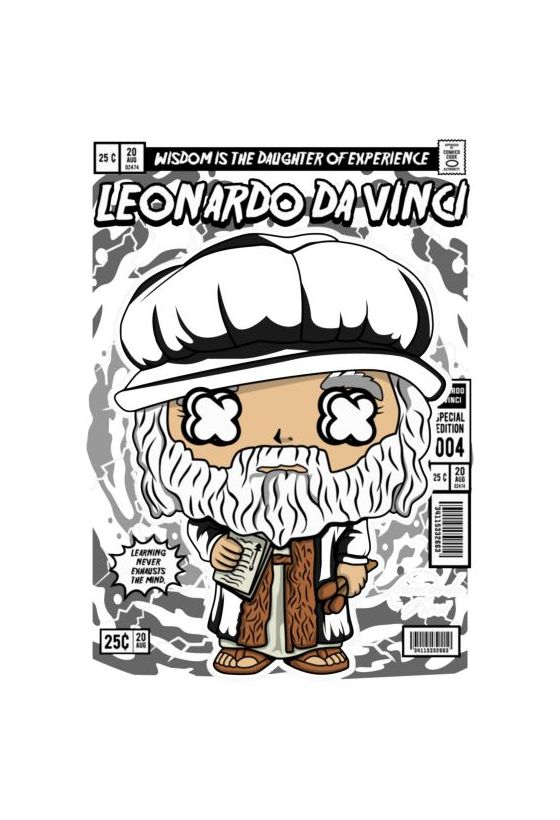 Funko Pop Leonardo da Vinci με βιβλίο και εργαλείο, κόμικ εξώφυλλο με quotes.