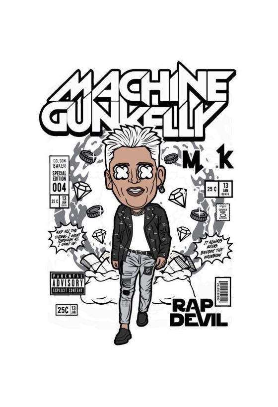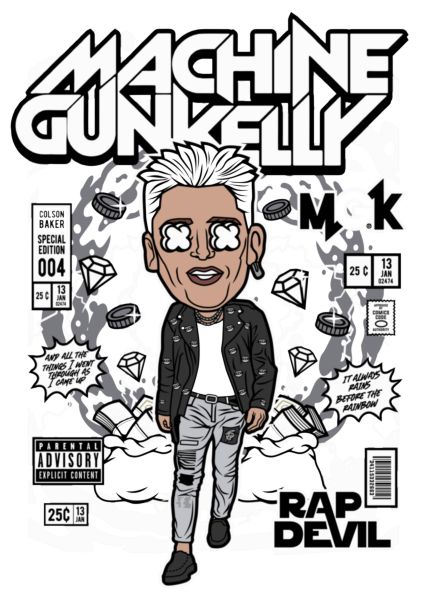 Machine Gun Kelly σε κόμικ στυλ με χρήματα, διαμάντια και quotes.
