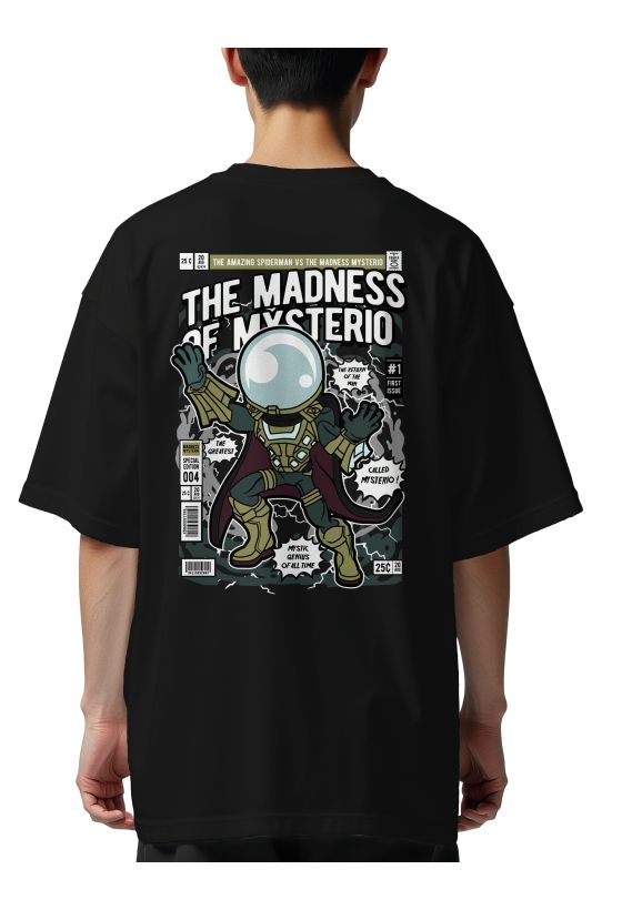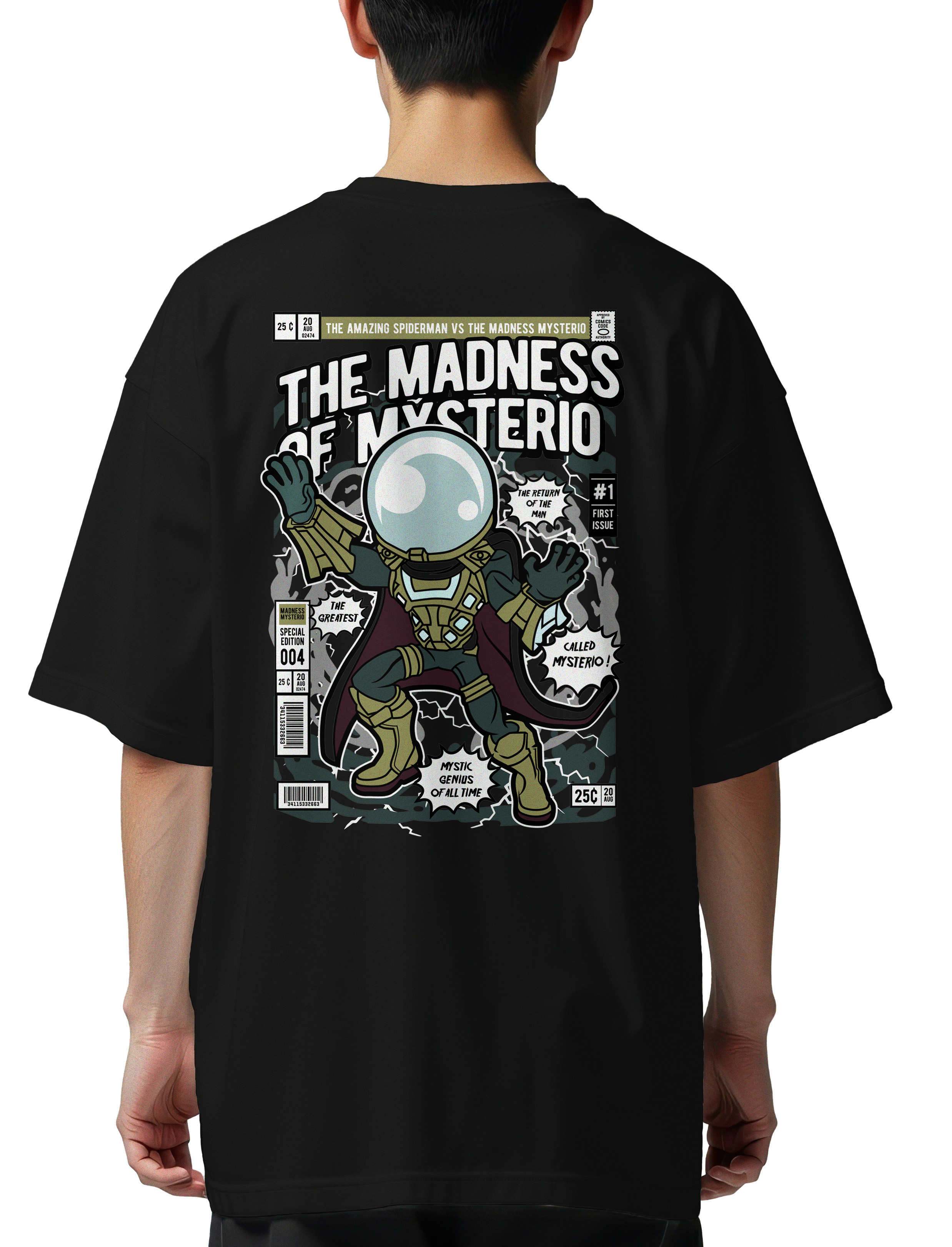 Ρετρό εξώφυλλο κόμικ με τον Mysterio από τη Marvel, σε δυναμική πόζα με κράνος και κάπα, σε σκοτεινό φόντο με συννεφάκια.