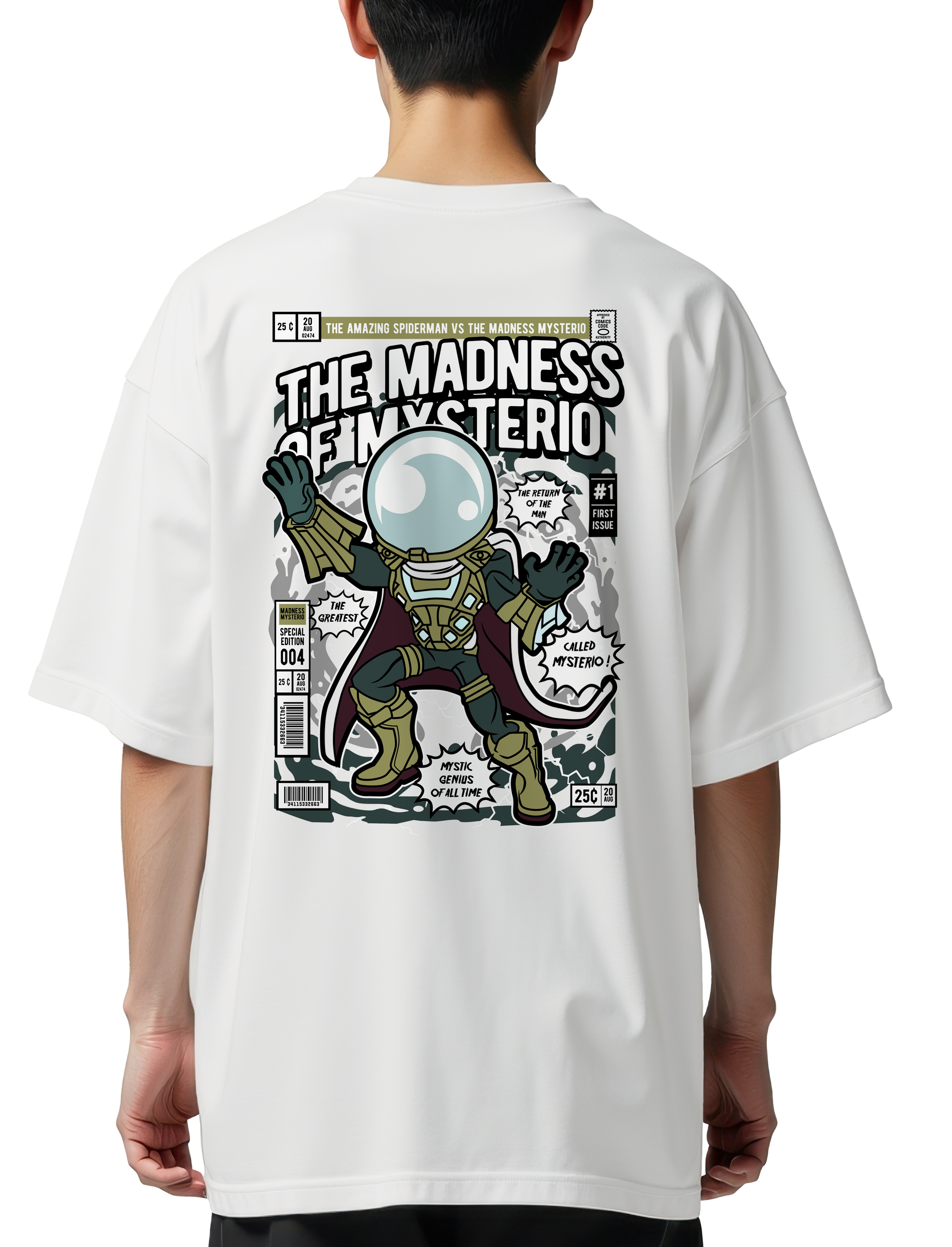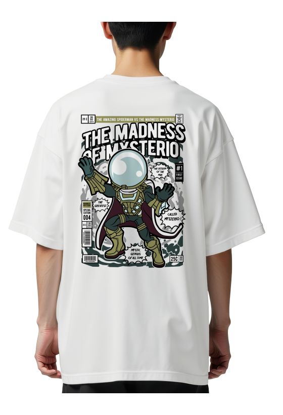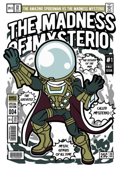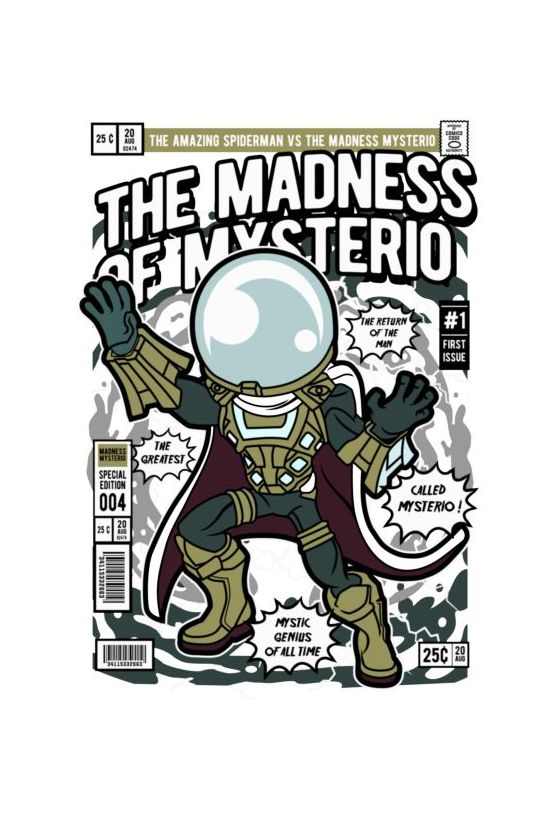 Ρετρό εξώφυλλο κόμικ με τον Mysterio από τη Marvel, σε δυναμική πόζα με κράνος και κάπα, σε σκοτεινό φόντο με συννεφάκια.