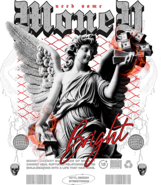 Φτερωτό άγαλμα κρατά καμένα χρήματα, σε φόντο grunge. Συνοδεύεται από κείμενα για τον πλούτο και τη ματαιότητα, με κόκκινα και γκρίζα μοτίβα.