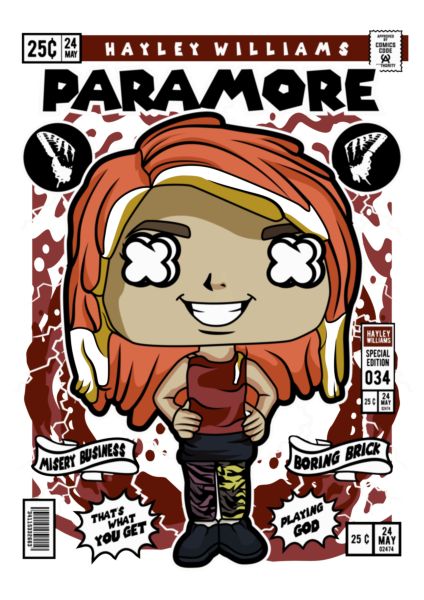 Εξώφυλλο κόμικ με την Hayley Williams (Paramore) σε στυλ Funko Pop, με κόκκινο-μαύρο φόντο και τίτλους τραγουδιών.
