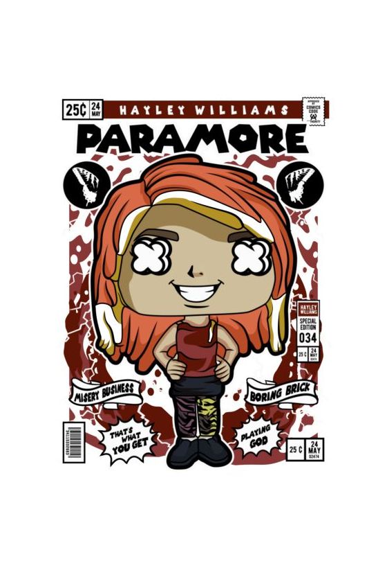 Εξώφυλλο κόμικ με την Hayley Williams (Paramore) σε στυλ Funko Pop, με κόκκινο-μαύρο φόντο και τίτλους τραγουδιών.