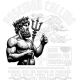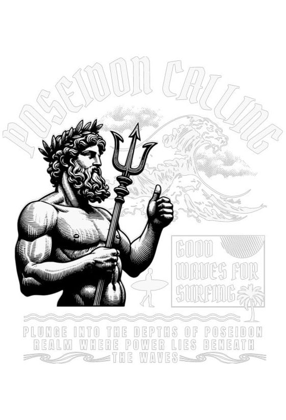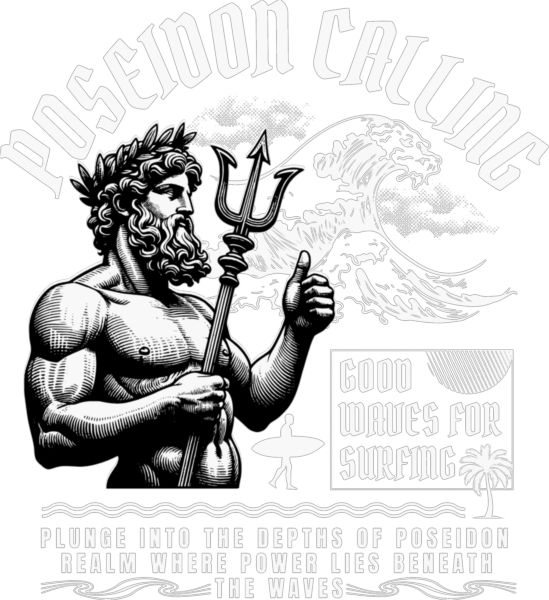 Ποσειδώνας με τρίαινα, κύματα και σέρφερ, κείμενο "POSEIDON CALLING".
