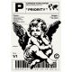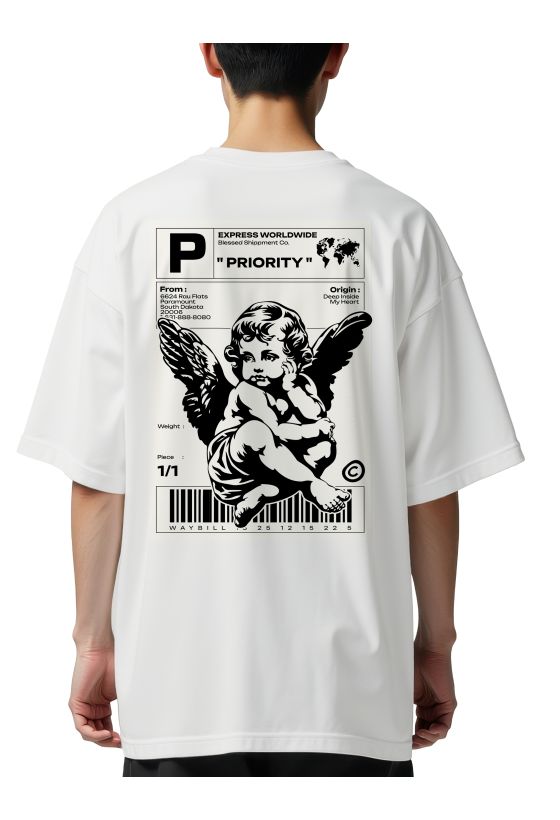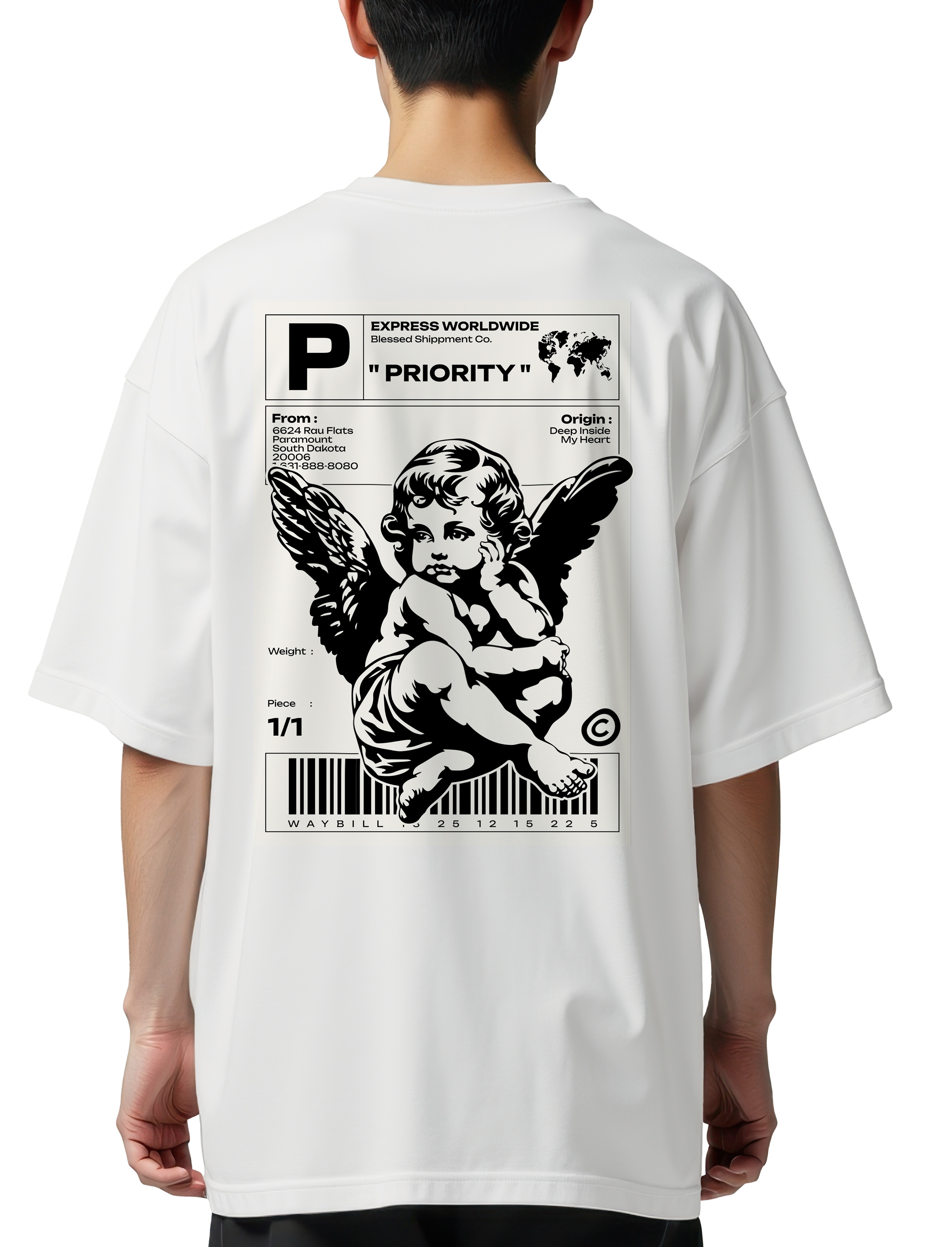 Στυλιζαρισμένη ετικέτα αποστολής με ασπρόμαυρη απεικόνιση χερουβείμ. Κείμενα «EXPRESS WORLDWIDE», «PRIORITY», «Origin: Deep Inside My Heart». Συνδυασμός εμπορικής και ρομαντικής αισθητικής.