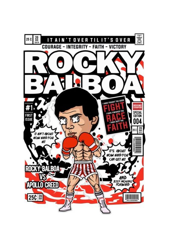 Rocky Balboa σε κόμικ στυλ με γάντια μποξ, quotes "IT AIN'T OVER...".