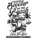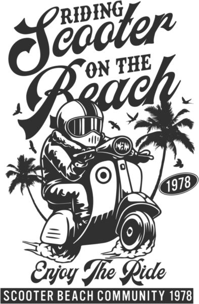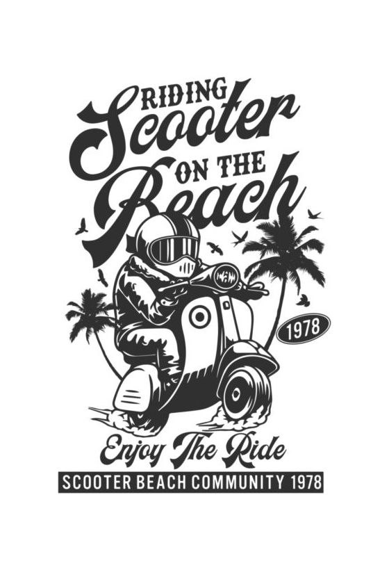 Vintage σχέδιο με σκούτερ στην παραλία, φοίνικες, κείμενα "RIDING Scooter ON THE Beach", "1978".
