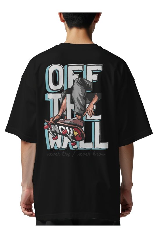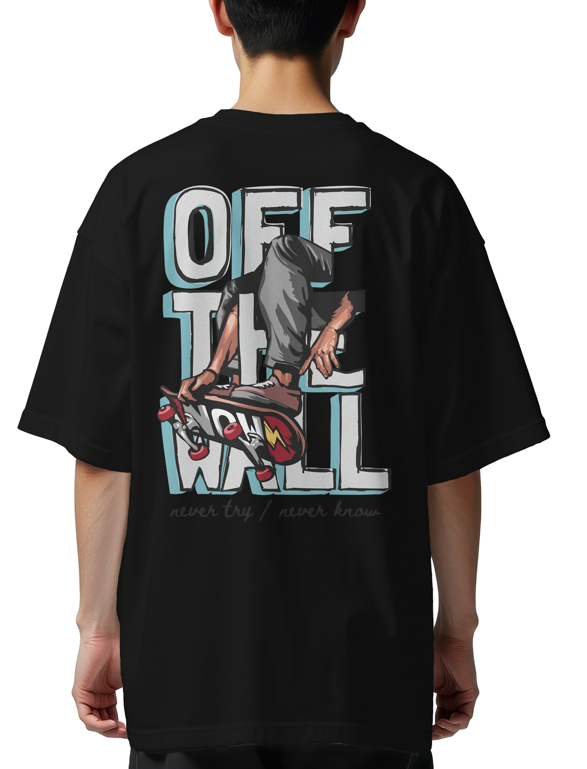 Skateboard trick με κείμενο "OFF THE WALL", quote "never try / never know".