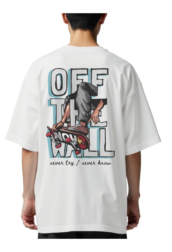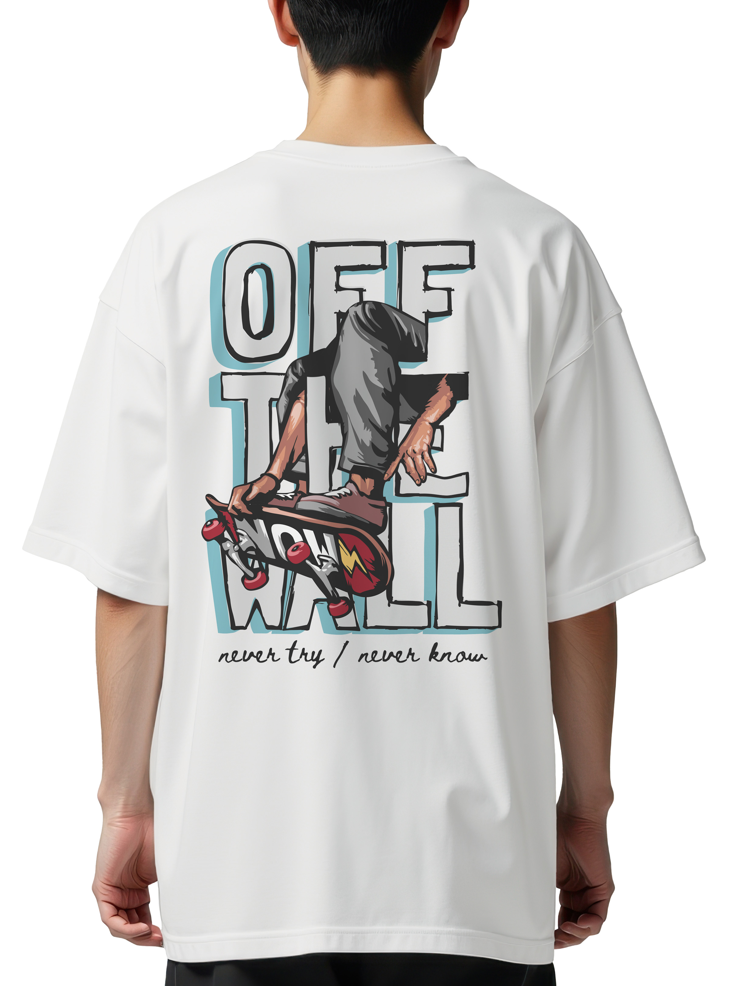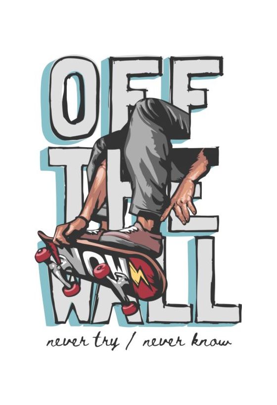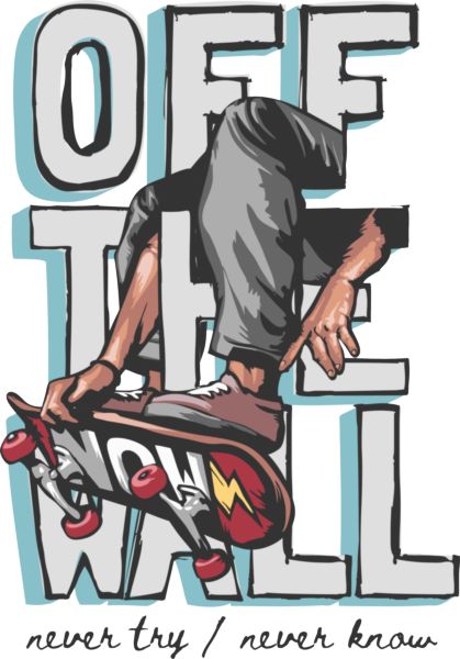 Skateboard trick με κείμενο "OFF THE WALL", quote "never try / never know".