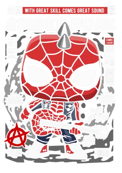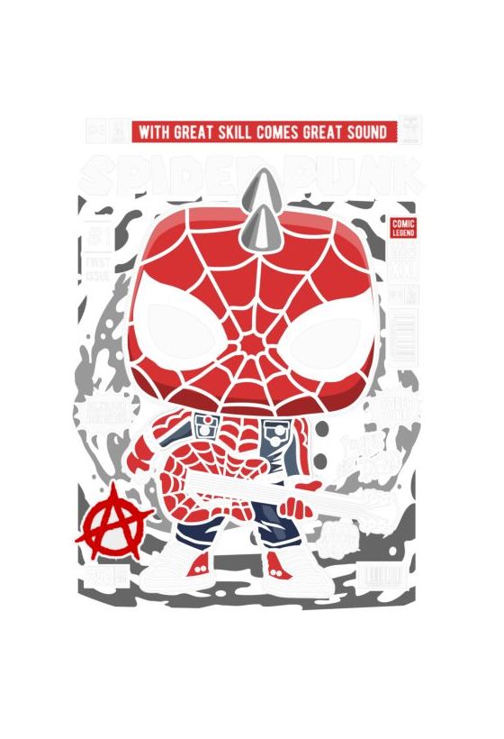 Spider-Punk σε Funko Pop κόμικ στυλ, κιθάρα, quote "Punks Not Dead".
