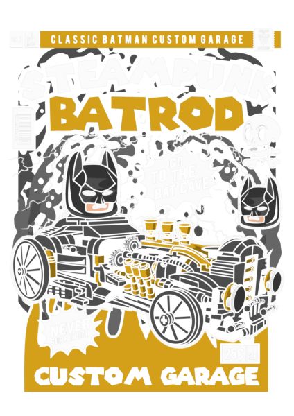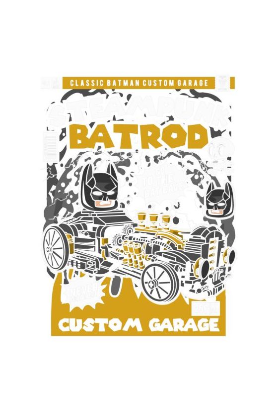 Steampunk Batmobile ("Batrod") σε κόμικ στυλ, με γρανάζια και κεραυνούς.