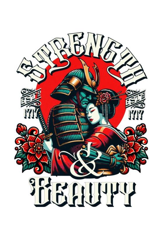 Σαμουράι με πανοπλία που αγκαλιάζει γκέισα με φλοράλ φουρκέτα, σε κόκκινο φόντο. Κείμενα «Δύναμη» και «Ομορφιά».