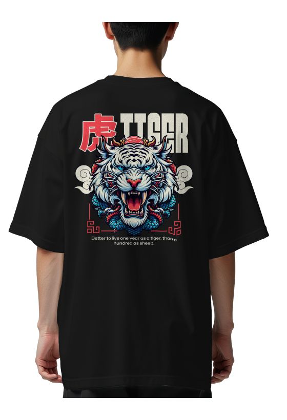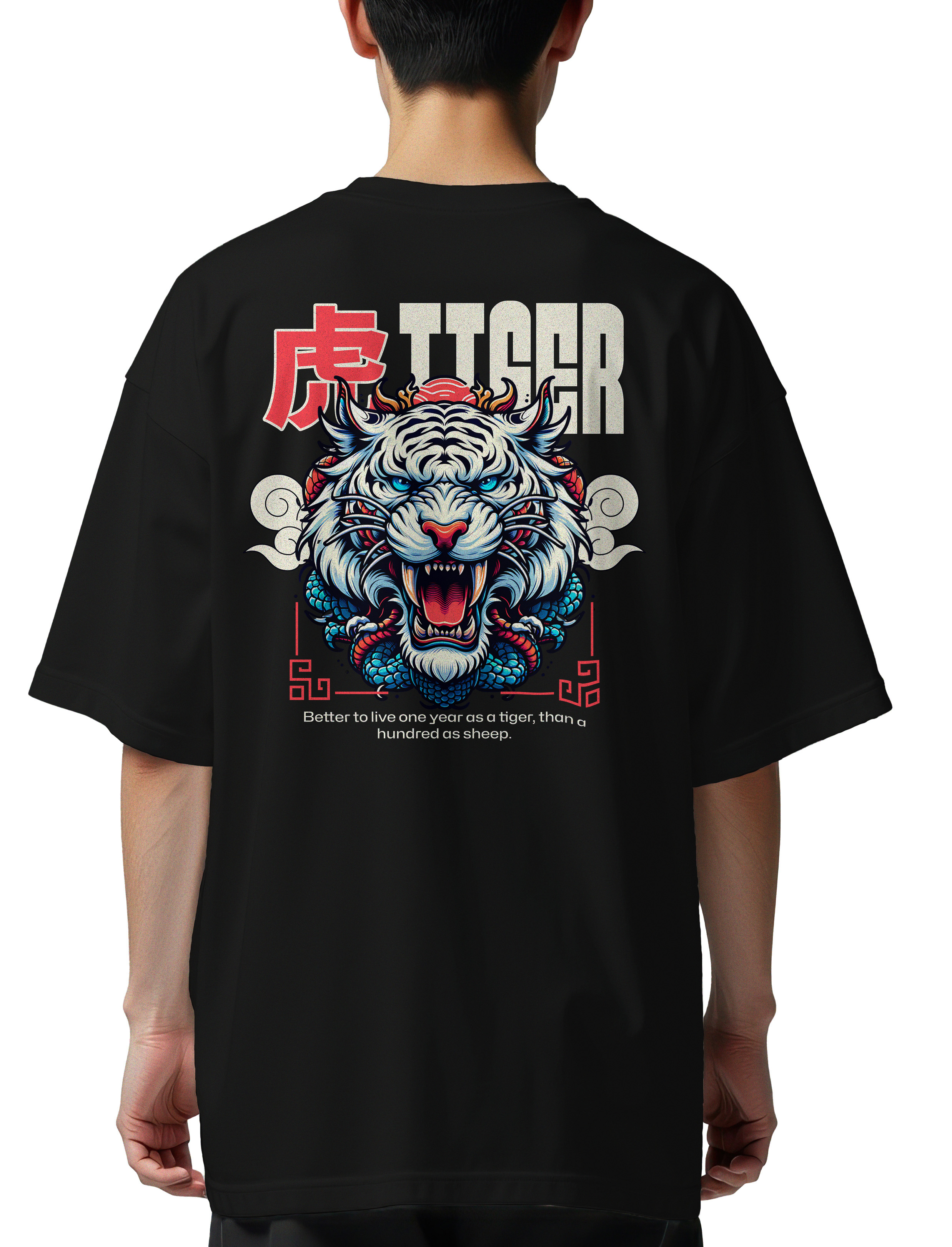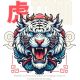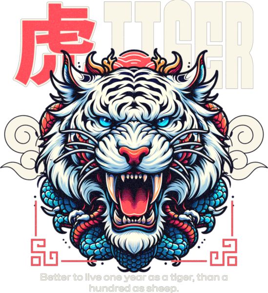 Λευκή τίγρη με μπλε μάτια, κείμενο «TIGER» και κινεζικό χαρακτήρα.