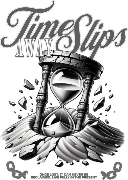 Σπασμένη κλεψύδρα, κείμενο «Time Slips AWAY». Μήνυμα για το πέρασμα του χρόνου.