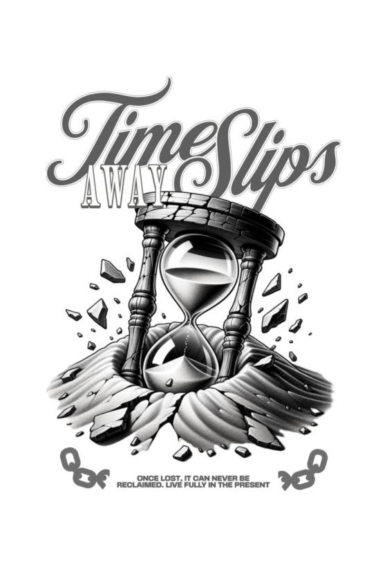 Σπασμένη κλεψύδρα, κείμενο «Time Slips AWAY». Μήνυμα για το πέρασμα του χρόνου.