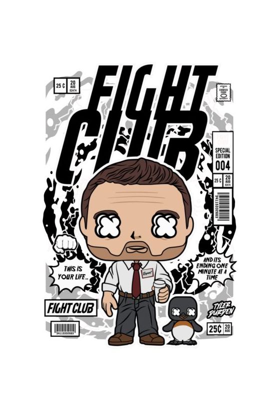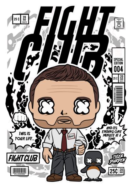 Funko Pop εκδοχή του Narrator από το Fight Club με καφέ και πιγκουίνο, τίτλος "FIGHT CLUB".