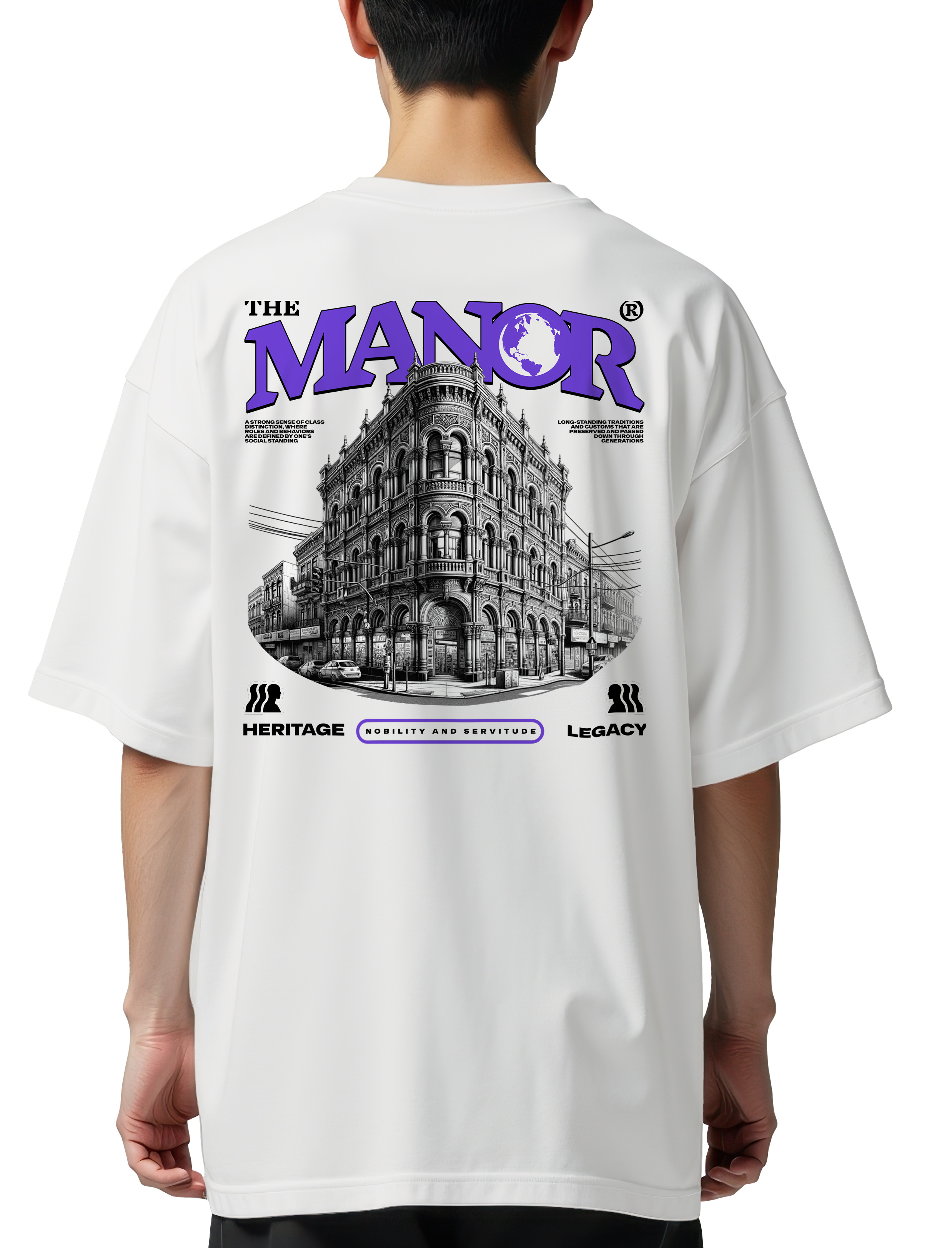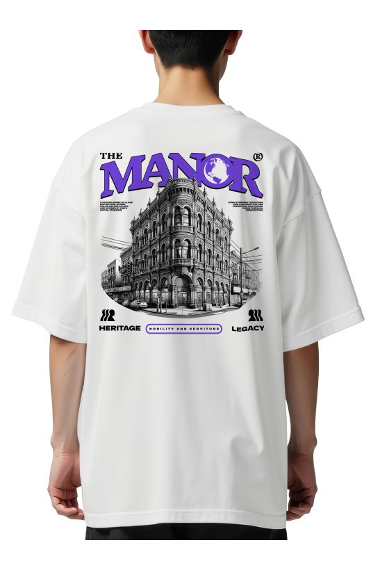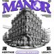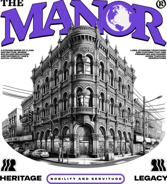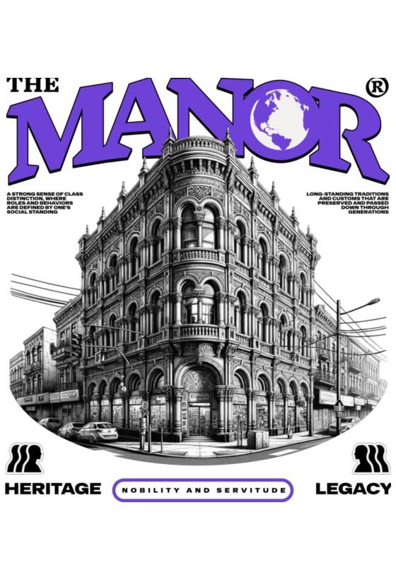 Λεπτομερές κτίριο, μωβ «MANOR» (το «O» ως σφαίρα)· vintage + μοντέρνα γραφικά.